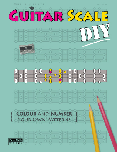 Fill in and make up the patterns that work for YOU, with dots, fingerings, scale degrees, colours. Half the job is done already, you do the rest! Available for scales and chords.
